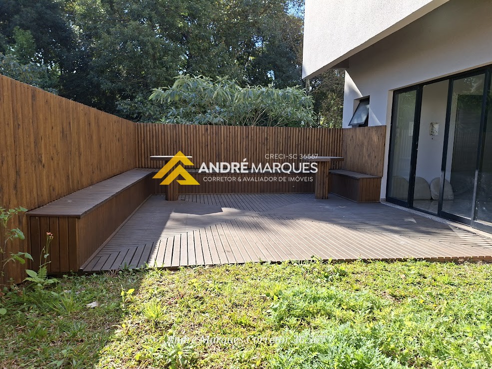 Deck e espaço externo comum com grama e namoradeira em anexo ao salão de festas;