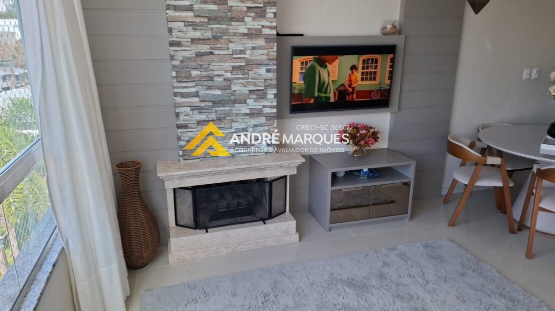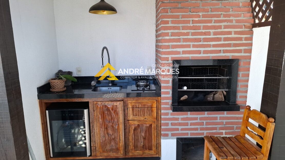 Andar inferior com dois quartos sendo uma suíte, um banheiro, cozinha e sala integrados, lareira.