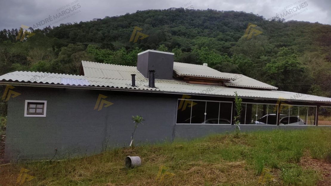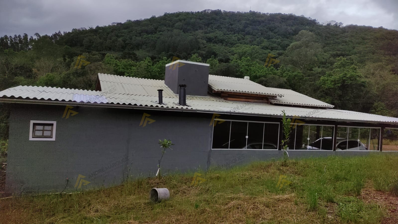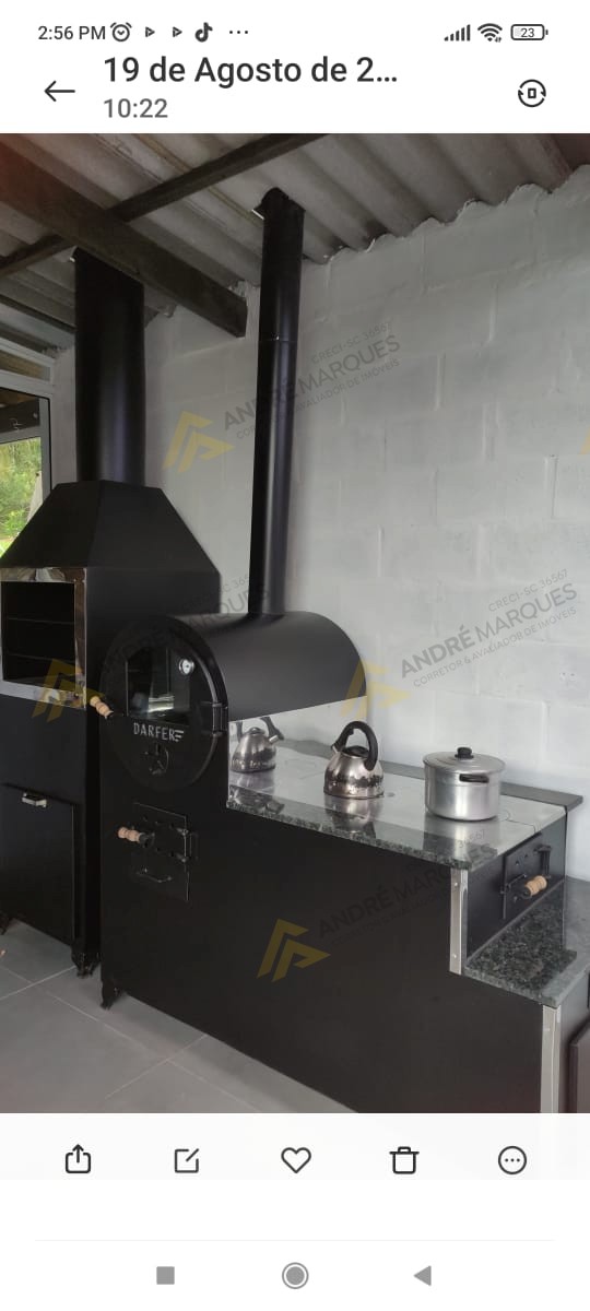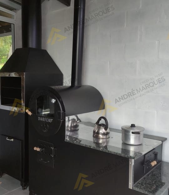 Sala de festas com fogão campeiro, Garagem para 03 veículos.